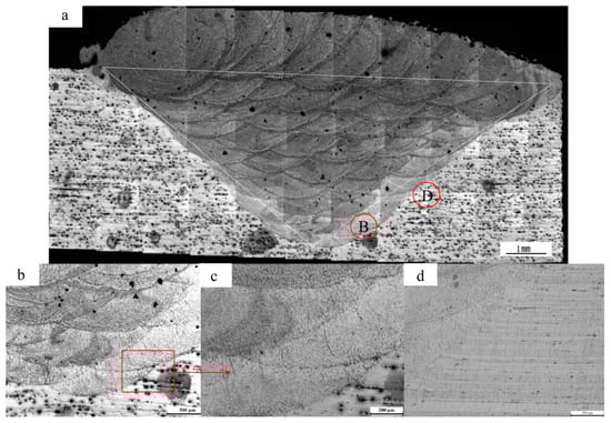 Figure 5. Panoramic and local enlarged image of OM of metallographic section in the restoration area, (c) corresponding to the framed of (b), (b,d) corresponding to (B) and (D) in (a), respectively.