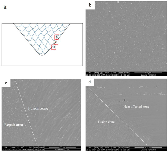 The DED process is characterized by a high-temperature gradient and fast cooling rate, which involves a rapid solidification process. The sediments release heat in three main ways, first through the conduction of adjacent laminar currents, then into the basement, and finally into the nearby atmosphere through convection and radiation. In this process, heat flows mainly through the adjacent sedimentary layers and the basement, and the influence caused through the atmosphere is quite limited [2,17]. Figure 6 shows the morphology of repaired parts of the aluminum alloy as observed under a scanning electron microscope. These parts are divided into a repair zone, fusion zone (transition zone), heat-affected zone (solid solution zone, over-aging zone), and matrix. According to Figure 6b,c, there are white spot-shaped and square-shaped Al3(Sc,Zr) particles distributed in the restoration area, which plays a role in the refinement of grains.