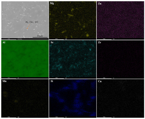 Figure 7. SEM image of distribution of Al, Zn, Mg, Sc, Zr, Mn, Si, and Cu elements in the restoration area.