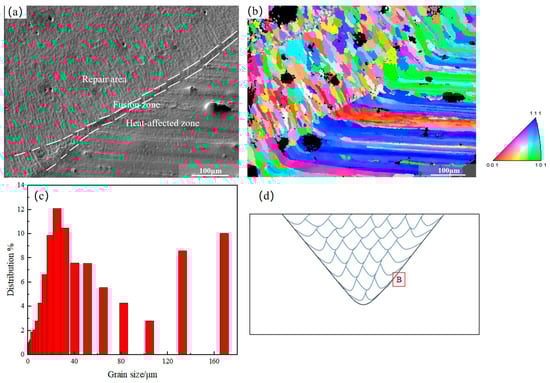 Figure 8. EBSD image and grain size of the transition region of the repaired sample: (a) EBSD; (b) Microstructure of fine columnar crystals; (c) Distribution of grain size; (d) Schematic diagram of fusion boundary.