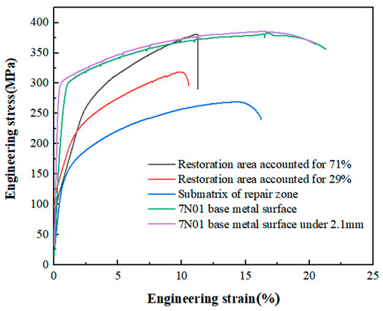Figure 9. Engineering stress–strain curves of aluminum alloy repair parts and base metal.