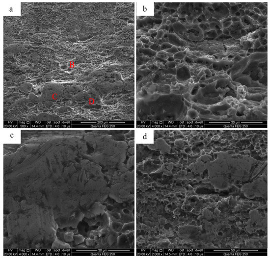 Figure 11. SEM image of tensile fracture in the repair area at room temperature, (bd) corresponding to (B–D) in (a), respectively.