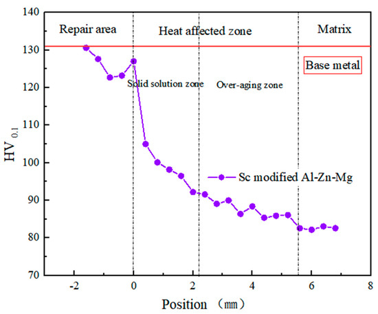 Figure 12 shows the side hardness of the repaired sample made of aluminum alloy, with the average hardness of the base metal reaching 131 HV. The hardness in the restoration area exceeds 120 HV, and the highest hardness is shown by 7N01 base metal. There is a significant decrease in the interface hardness of the repair zone, which is because the solid solution zone (heat-affected zone) is formed after the powder material melts and mixes with the matrix to resolidify. In this area, its composition and microstructure are not uniform. Additionally, the thermal cycle temperature is fairly high, which results in the partial or complete melting of the demelting phase of aluminum alloy into the matrix [13,16], whose hardness varies between 90 HV and 126 HV. The over-aging zone (heat-affected zone) underwent a low peak heat drive, which converts the metastable phase into a stable phase, thus eliminating the semi-coherent relationship with the matrix. Consequently, the hardness is reduced to the minimum, ranging between 83 and 90 HV. The hardness from the aging zone to the matrix fluctuates around 83 HV. Due to the large temperature gradient in the DED process, the substrate softens, and the level of hardness decreases, which is consistent with the mechanical properties tested before.
