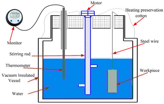 where qs represents the energy obtained by the workpiece, J; c is the specific heat capacity of the water (4.2 × 103 J/kg·°C)); m is the weight of the water in the measuring device (kg); T1 is the initial temperature of the water in the vessel; T2 is the finishing temperature of the water in the vessel;