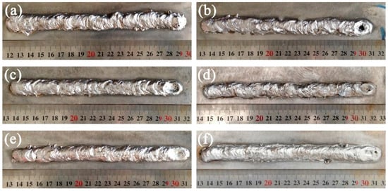 Appearances of underwater wet welds with different thermite content: (a) 0, (b) 10%, (c) 20%, (d) 30%, (e) 40%, (f) 50%.