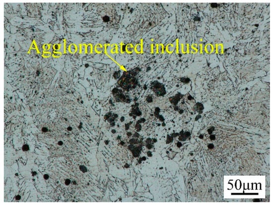 When the thermite content exceeded 40%, as illustrated in Figure 7, a large number of inclusions agglomerated in the weld metal. This agglomeration reduced the bearing capacity of the welded joint. This was because the aluminothermic reactions produced a large amount of Al2O3, which significantly changed the properties of the slag. Slag with a high melting point cannot be quickly separated from the molten pool. Therefore, the excessive addition of thermite was undesirable in the flux. Meanwhile, it was predicted that with an increase in the thermite content, the inclusions would have a tendency to increase in diameter.