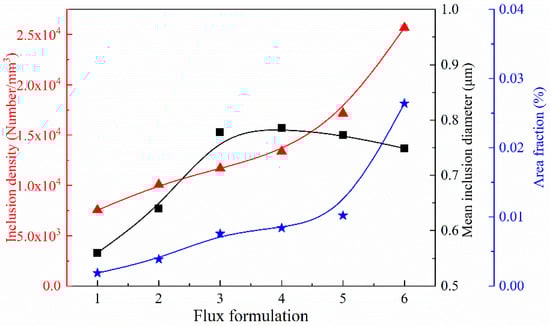 It was clear that the addition of thermite altered the metallurgical behavior of the weld metal. The microstructure of the weld metal was mainly determined by the welding heat input, alloying element content, and oxygen content (the number of oxide inclusions) []. The welding heat input required to melt the wire varied with thermite content, as evidenced by the welding current value. The difference in heat input also affected the weld metal microstructure. Conventional metallurgical ingredients, such as Mn, Ni, and Mo, were not included in the formulation for the flux-cored wires. There should be other reasons for this obvious change. It has been predicted that the addition of thermite may lead to an increase in the amount of oxygen in the weld metal. The relevant research indicated that variations in the weld metal’s oxygen content also affected the microstructural features of the weld metal [,]. Therefore, in the current study, it was necessary to analyze the changes in the amount and content of inclusions caused by the addition of thermite.