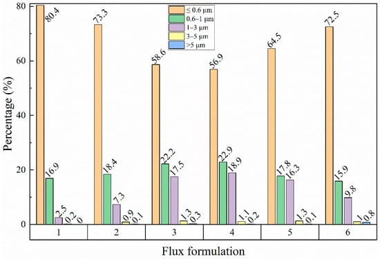Although the size of the inclusions did not increase with thermite concentration, the number of large inclusions did. Figure 9 displays the distribution of different-size inclusions in the weld metal after statistical analysis for each thermite concentration. The figure shows that the majority of the inclusions in the weld metal measured less than 0.6 mm, followed by inclusions measuring 0.6–1 μm, and the fewest inclusions measured more than 3 μm. As a result, the sizes of the inclusions in the underwater wet weld metal with a TiO2-SiO2-CaO slag system were mostly concentrated in the 0–1 μm. These inclusions accounted for more than 80% of the total quantity.