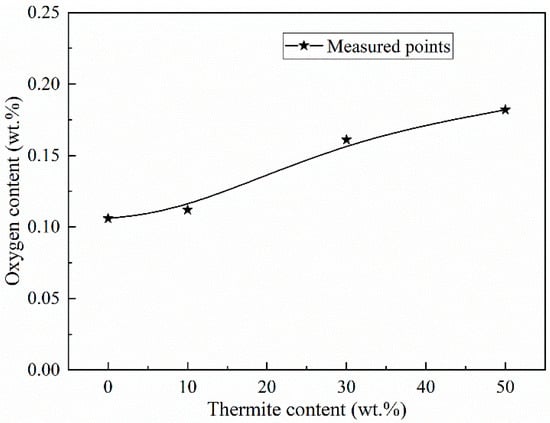 The oxygen concentration of the underwater wet welds with different thermite additions also changed dramatically. The oxygen content variations were measured using an oxygen and nitrogen analyzer, and the results are displayed in Figure 10. The basic formulation’s weld metal had an oxygen content of 0.106 wt.%. The oxygen concentration of the weld metal increased as a result of thermite addition. When the thermite content reached 50%, the weld metal’s oxygen content was 0.182 wt.%. The oxygen was mainly in the form of finely dispersed oxide inclusions. The use of thermite increased the amount of oxide inclusions in the weld metal, resulting in an increase in oxygen content. This was consistent with the results in Figure 7 and Figure 8. According to Harrison [], higher inclusion contents tended to decrease austenite grain size and increase the amounts of polygonal ferrite and secondary side plates because the transformation temperature changed as a result of the interaction of inclusions with austenite grain boundaries. At the same time, the nucleation of fine intragranular ferrite (acicular ferrite) was aided by oxygen inclusions. This could be used to explain the influence of thermite addition on the microstructure of the weld metal, as shown in Figure 7.