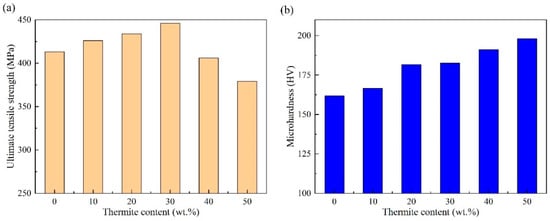 - An obvious change in microstructure was observed due to the addition of thermite caused by the de-oxidation products of the thermite process. The ultimate tensile strength first increased and then declined with the addition of thermite. A maximum of 446 MPa was obtained with a thermite percentage of 30 wt.%.