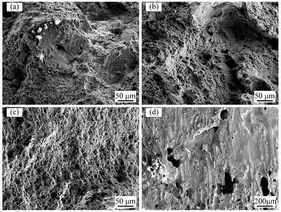 The fracture surface contained a certain percentage of coarse dimples when the thermite content was less than 50%, as shown by the fracture morphology in Figure 12c. However, the overall fracture was flat, and the diameter and depth of the coarse dimples were small, resulting in lower tensile strength under this parameter. When the heat input was above 50%, the number of inclusions until an agglomerated slag formed in the weld, as shown in Figure 12d. The presence of unmelted slag with a high melting point on the microfracture surface lowered the joint’s load-carrying capacity. An excessive number of inclusions also increased the stress concentration problem inside the weld metal and produced microcracks, which further reduced the joint strength.