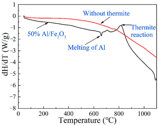 We used differential thermal analysis (DSC) tests with multi-component flux, without and with 50% thermite, to determine the exothermic reaction’s onset temperature. The results are depicted in Figure 13. No exothermic peaks were observed in the DSC curves when no thermite was present. The graphs showed obvious heat absorption peaks (at the melting point of Al) and exothermic peaks (the thermite reaction) when thermite was added to the flux, indicating that thermite had a thermogenic effect. It should be noted that the core contained gas-forming, slag-forming, and arc-stabilizing components, which were in direct contact with the Al/Fe2O3 system. For example, Al in the flux may react with the slag-forming component TiO2, and Mn may also react with Fe2O3. The beneficial effect of the Al/Fe2O3 exothermic reaction will be restricted by these reactions.