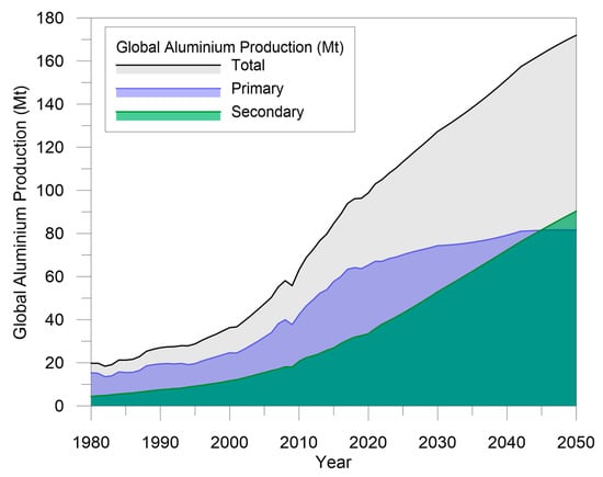 Recent developments in the automotive industry, rapid urban growth, and the innovative uses of aluminum both in the power and construction fields are contributing to aluminum’s rise as a dominant structural and engineering material. For this reason, aluminum production is currently facing a challenge: meeting the growing demand of consumers and, at the same time, improving the sustainability of the production processes to reduce their environmental impact. In this context, aluminum recycling involves significant economic and environmental benefits because it allows reducing emissions and energy requirements by up—to 95% compared to primary production. It is estimated that about one-third of the aluminum produced today originates from scrap [2]. This amount is expected to increase drastically. According to data from the International Aluminum Institute, by 2050, the amount of recycled, also called secondary, aluminum will account for more than 50% of the total aluminum production [4], as shown in Figure 1.