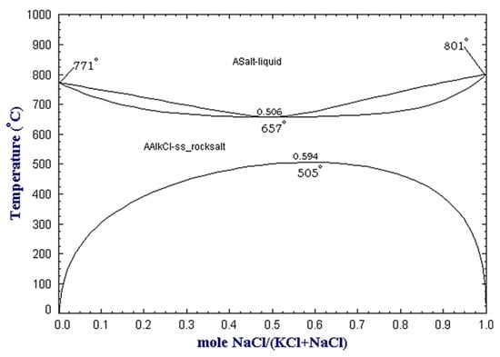One of the most popular techniques to suppress molten aluminum oxidation is the use of a cover salt flux. The salt is added during the melting process, and it floats over the molten aluminum due to a lower density, protecting it from further oxidation. The most common salt mixtures for this purpose consist of NaCl-KCl mixtures with small additions of fluorides. When melting aluminum, only those chlorides more stable than aluminum chloride can be selected to avoid chemical reactions between the metal and the salt. Thus, the available options are restricted to the chloride salts of alkali and alkali-earth metals such as NaCl, KCl, CaCl2, and MgCl2. Moreover, NaCl and KCl are the most convenient solution as they are cost-effective [12]. At the same time, pure NaCl melts at 801 °C and KCl at 771 °C, and an equimolar mixture forms a eutectic point at 657 °C, as shown in Figure 2. The equimolar mixture is mostly used in the USA and Canada; however, higher NaCl contents, such as 70 wt %, are also widely employed, especially in Europe, due to the higher cost of KCl if compared to NaCl [2,15].