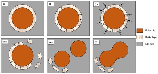 Sketch showing the stripping process of the oxide layer covering an Al droplet by means of salt flux and coalescence of the Al droplets: (a) Al droplet surrounded by the oxide layer in the molten salt flux, (b) crack generation in the oxide layer, (c) penetration of the flux between the oxide layer and the molten Al, (d) detachment of the oxide layer, (e) Al droplets coming into contact and (f) coalescence of the Al droplets.