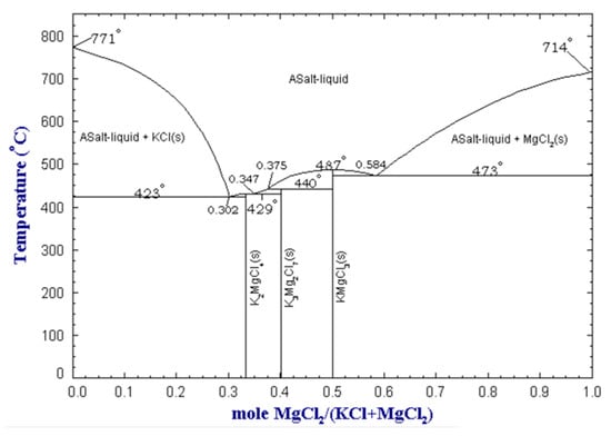 MgCl2-KCl binary phase diagram at atmospheric pressure, obtained from the FactSage™ FTsalt database [16].