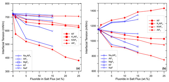 Effect of some fluoride additions in the flux on the interfacial tension (a) between flux and aluminum melt and (b) between flux and aluminum oxide. Data collected and elaborated from [11,22].