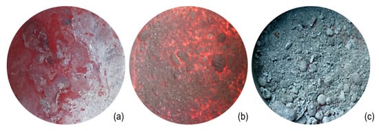 Drossing fluxes are added to ease skimming, that is, the removal of the dross layer, which forms because of metal oxidation. Drossing fluxes should also ensure the release of aluminum metal from the oxides. Thus, such fluxes are composed again mainly of chlorides, but the quantity of fluorides (both simple and double) is greater if compared to cover fluxes. These fluxes are designed to release heat; therefore, oxidizing agents are also present to promote the exothermal reactions that assist the coalescence [21]. Exothermal reactions are also promoted by the presence of double fluorides such as Na2SiF6. Drossing fluxes assist in the removal of metallic aluminum from the dross, which is usually present in contents up to 60–80 wt %. In this way, the dross changes its appearance from wet (light color, with a high metal content) to dry (dark and powdery, with a low residual metal content). These fluxes are usually spread on the molten metal bath and stirred to enhance their reactivity. If the dross is treated properly, its metallic concentration can be reduced to 30 wt % [24], leading to powdery dross, which can be skimmed off more easily. The action of a drossing flux is shown in Figure 6, which highlights the aspect and morphology of the dross before, during, and after treatment with the flux.