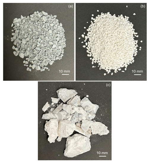 Granulated salt fluxes: (a) medium-sized drossing granulated flux, (b) fine-sized drossing granulated flux, and (c) coarse-sized granulated flux for scrap remelting.
