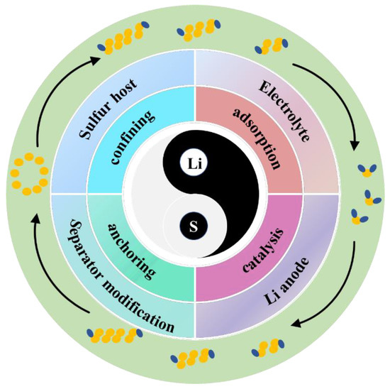 In order to tackle the above critical obstacles, researchers have extensively investigated the performance improvement of LSBs mainly from four aspects: sulfur cathodes, electrolytes, separators, and Li anodes [12,13,14,15]. Figure 1 depicts the reaction mechanism of the interconversion of S8 and LiPSs during charging and discharging, explaining the reasons for the slow reaction kinetics and the mechanism of catalytic LiPS conversion. Physical confinement and chemical adsorption strategies are common strategies for inhibiting the diffusion of LiPSs [16]. However, high sulfur loading cannot be achieved due to the limited adsorption sites. Accelerating redox reactions is another effective method to restrain the migration of LiPSs [17]. Recently, catalysis has been proposed for accelerating the conversion of soluble LiPSs to solid products and reducing their accumulation on electrolytes [18]. Undoubtedly, once sulfur host materials with strong adsorption and fast catalytic conversion of LiPSs are synthesized, the inhibition of the shuttle problem and an improvement in the redox kinetics of LiPSs can be achieved simultaneously. Therefore, it is imperative to explore new catalytic hosts for achieving high-energy-density LSBs.