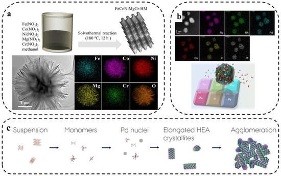 Broge and coworkers [59] used the solvothermal method to synthesize PtIrPdRhRu HEAs. Homogeneous materials were obtained within a relatively narrow temperature window of about 200 °C, which is well below the reduction temperature of some metals in the solvothermal reaction of a single precursor (Figure 5c).
