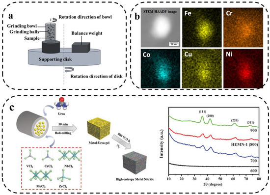 M.Y. Rekha et al. reported the synthesis of multi-component NiFeCrCoCu HEA nanoparticle-graphene composites using mechanical ball-milling and ultrasound-assisted exfoliation methods [63]. As shown in Figure 6b, the five transition metals are uniformly distributed. Jin et al. [64] prepared a new class of high-entropy metal nitrides (HEMNs) via a two-step mechanochemical synthesis. As shown in Figure 6c, the five transition metal chlorides were mixed with urea in a ball-milling process to produce highly dispersed precursors, which were subsequently pyrolyzed under N2 conditions. The use of five metal elements significantly increased the conformational entropy. In addition, Hari Prasad et al. [65] prepared FeNiCoCrAlMn HEA containing dispersed alumina using mechanized synthesis. The results show that the dispersion of alumina had no effect on the organization of the alloy. Both alloys have FCC and BCC biphasic structures and contain a small number of Mn3Co7 phases.