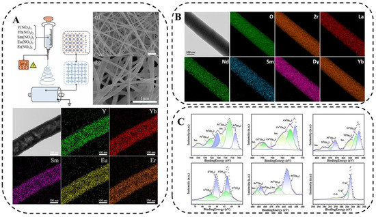 To demonstrate the feasibility of the low-temperature synthesis of high-entropy ceramic nanofibers (HECNFs) by electrospinning, Xing [78] synthesized high-entropy (Y0.2Yb0.2Sm0.2Eu0.2Er)O0.223 nanofibers via a new electrospinning method and low-temperature solid-solution treatment. Li [79] proposed a method for the facile preparation of high-entropy ceramic nanofibers (La0.2 Nd0.2Sm0.2Dy0.2Yb)0.22ZrO27(HE-RE2ZrO27) via an electrospinning and annealing process and systematically investigated its microstructure and thermal stability. Figure 9B shows the typical nanofibers and their compositional energy spectra of HE-RE2ZrO27 nanofibers when sintered without insulation at 1000 °C. It can be seen that HE-RE2ZrO27 nanofibers are internally composed of fine nanoparticles and various rare-earth elements are uniformly distributed in the fibers, and this structure makes them promising for applications in the field of thermal insulation. Zhu et al. [80] in situ synthesized FeCoNiIrRu HEA nanocrystals in carbon nanofibers (CNFs) using a combination of electrospinning and graphitization and investigated the chemical composition and electronic states of FeCoNiIrRu/CNFs via x-ray photoelectron spectroscopy (Figure 9C).
