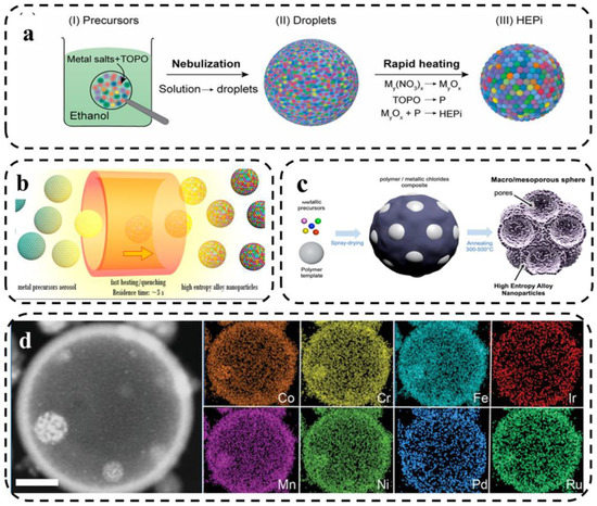 Here, Qiao et al. [81] reported the synthesis of high-entropy phosphate (HEPi) catalysts (CoFeNiMnMoPi) in the form of highly homogeneous spherical particles. As shown in Figure 10a, the metal salt precursors were dissolved in ethanol solution and tri-n-octylphosphine oxide (TOPO) was added. Aerosol droplets were formed by spraying, and the oxide was converted into phosphate in situ during high temperature and rapid heating. Jennifer et al. [82] analyzed the formation mechanism of HEA nanocrystalline-based macro- and mesoporous materials and the role of templating agents by using different templating agents to synthesize HEA via spray pyrolysis. The level of chemical and structural complexity achievable by spray pyrolysis was significantly improved by fabricating HEA-based particles with controlled porosity.