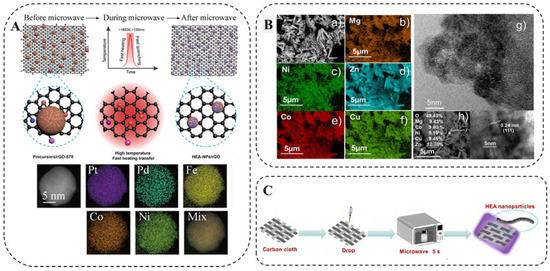 (A) Schematic illustration of the formation of HEA-NPs on rGO by microwave heating, HAADF-STEM image, and STEM-EDS elemental mapping of a PtPdFeCoNi HEA-NPs [88]. (B) SEM image and EDS elemental mapping of (CoCuMgNiZn)O powder [89]. (C) Schematic diagram of microwave-assisted synthesis [90].