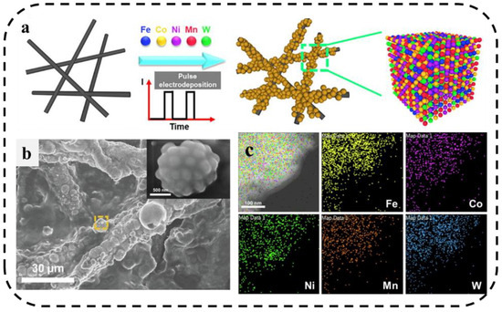Due to the transient high current density, pulsed electrolysis can increase the cathodic overpotential at the same current density (compared with direct current (DC)). Lu et al. [91] developed a pulsed current electrodeposition method to grow a FeCoNiMnW HEA(H-FeCoNiMnW) on the surface of carbon paper. As shown in Figure 12a–c, the morphological characterization shows that the material is spherical and has a uniform distribution of various elements, which can be used as an efficient and stable bifunctional electrocatalyst for HER and OER in acidic media.