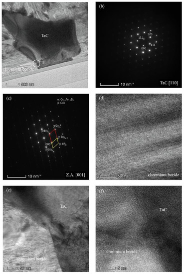 Figure 1. TEM photographs of Ta-containing coatings: (a) morphology; (b) SAED of TaC; (c) SAED of chromium borides; (d) HRTEM of chromium boride; (e) high magnified view labeled in (a); (f) HRTEM of the interface between TaC and chromium boride, reprinted with permission from Ref. [36], Copyright 2021 Elsevier.