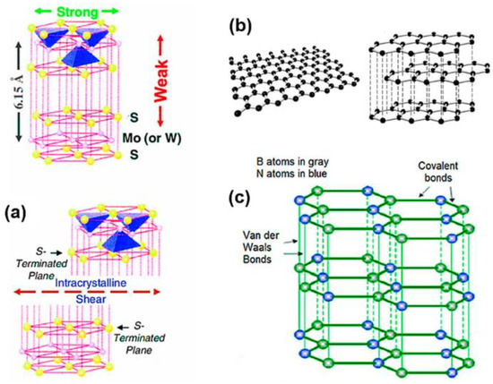 Figure 2. Crystal structure of several typical lamellar solid lubricants: (a) MoS2 (or WS2); (b) A single graphene layer and graphite as a stack of multiple graphene layers; (c) h-BN, reprinted with permission from Ref. [44], Copyright 2018 Taylor & Francis and reprinted from Ref. [45].