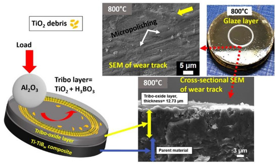 Figure 4. A mechanism to reduce wear at high temperatures by forming a uniform friction layer (composed of TiO2 and boric acid), reprinted from Ref. [45] and reprinted with permission from Ref. [48], Copyright 2021 Elsevier.
