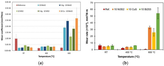 Figure 5. The results of sulfide on the friction coefficient and wear rate of coating: (a) Wear coefficient, reprinted with permission from Ref. [50], Copyright 2018 Elsevier; (b) Wear rate, reprinted with permission from Ref. [51], Copyright 2023 Elsevier.