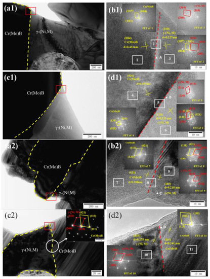 Figure 7. Results of TEM analysis. (a1,c1): bright field phase of A1; (a2,c2): bright field image of A2; (b1,d1): HRTEM and FFT results of selected region of A1; (b2,d2): HRTEM and FFT results of selected region of A2, reprinted with permission from Ref. [67], Copyright 2021 Elsevier.