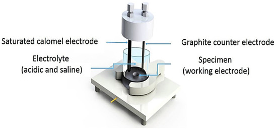 The electrochemical response to a corrosive media for the heat-treated specimens was investigated, using the potentiodynamic polarization on the Gamry instrument interface 1000 Potentiostat/Galvanostat/ZRA. According to Figure 2, the experimental cell consists of a three-electrode system: the specimen as a working electrode, the saturated calomel electrode (SCE) as a reference electrode, and the graphite rod as a counter electrode. The test was performed at room temperature in the acidic media with 1 wt.% H2SO4 and 3 g/L NH4SCN at a pH of 1.1. All the potentiodynamic polarization tests and electrochemical impedance spectroscopy (EIS) were carried out after the stabilized open-circuit potential (OCP) was reached. The electrochemical specimen masks included in the PTC1 kit aided in defining the 1 cm2 working area on the specimens placed within the cell. The electrolytes used in this test were prepared in accordance with the NACE TM 0284-2016. After the corrosion test, the morphology of the corroded surface and corrosion products was examined using SEM and a Bruker D8 Discover X-ray diffractometer (XRD) (Bruker, Billerica, MA, USA), respectively.