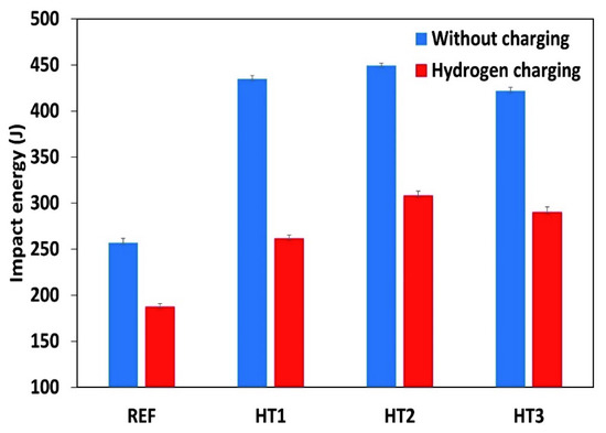 Figure 3 presents the Charpy test results for the Ref., HT1, HT2, and HT3 specimens at room temperature. The applied heat treatments improved the impact energy values of all the tested steels by 40%; however, the HT2 specimen had the highest impact. This indicates that tempering at 600 °C was responsible for the increase in impact Charpy energy in both the uncharged and charged specimens. However, it is worth mentioning that the differences in the impact energy of all the heat-treated specimens were small. Further, the impact energy values in all steels were reduced by a range of 27 to 40% following electrochemical hydrogen charging.