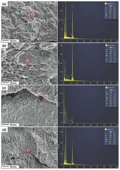 Figure 5 shows the EDS point spectrum of the inclusions around the HIC cracks for the pipeline steels after hydrogen charging for the Ref., HT1, HT2, and HT3 steels. This image shows that some inclusions are observed in the microvoids of the fracture surface. As seen in the EDS scans, the Mn-, Al-, and S-based inclusions are seen on the fracture surface in the Ref., HT1, and HT3 steels after hydrogen charging. The Mn-, Al-, and S-based inclusions are susceptible to fracture initiation. Bigger inclusions containing Mn, Mg, and S are observed on the fractured surface of the HT2 specimen.