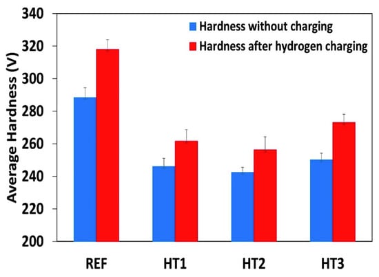 Figure 6 shows the microhardness of all the tested steels before hydrogen charging and after 24 h of hydrogen charging. One can see that the average hardness values in the Ref., HT1, HT2, and HT3 specimens increased by 11.5%, 7.7%, 6.1%, and 8% respectively, compared with the uncharged specimens, indicating the effect of hydrogen embrittlement. Based on the increments in the hardness value after hydrogen charging, the hydrogen embrittlement susceptibility was maximal in the Ref. and HT3 specimens, while it was lower in the case of the HT2 and HT1 specimens. Latifi et al. [39] also investigated the effect of electrochemical hydrogen charging on the hardness of API X65 pipeline steel. They noted that the micro-hardness of the steel was considerably increased after hydrogen pre-charging. The increase in the hardness value was related to the locking of dislocations in the presence of hydrogen. This phenomenon may be observed in other types of steel [39].