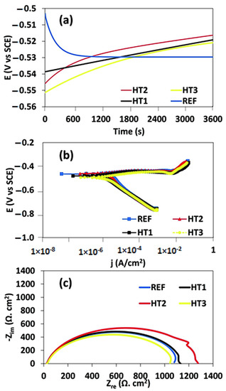 Figure 7a–c and Table 2 represent the results of the potentiodynamic polarization test and electrochemical impedance spectroscopy, including the OCP curve, Tafel curve, and Nyquist plot for all the Ref., HT1, HT2, and HT3 steels exposed to corrosive media. OCP is the potential created between the steel surface and the environment, with respect to a reference electrode. Figure 7a depicts the evolution of the OCP curves at various steel specimens submerged in a solution. In the Ref. specimen, the EOCP started at −500 mV and then monotonically decreased, and the steady state was reached after 3600 s. This indicates that the Ref. specimen has a high level of corrosion activity in an acidic environment. In contrast, the OCP curve for the heat-treated specimen monotonically increases until it reaches a steady state, showing a decline in its activity in acidic media with time and hence, a better corrosion resistance than that of the Ref. specimen. However, when comparing their potential, the OCP curves for HT2 are comparatively shifted towards a less negative potential than those for HT1 and HT3, showing that the corrosion activity is significantly reduced in acidic environments. Further, compared to other heat-treated specimens, the HT3 specimen showed a more negative potential and hence a higher level of corrosion activity. The HT1 and HT3 specimens showed a significantly lower level of activity in acidic media, compared with that of the Ref. specimen. This behavior may be attributed to the higher tendency for passivation in the heat-treated specimen in corrosive media in contrast to the Ref. specimen. A similar behavior for the OCP has been reported in the past, in which the initial dissolution of bare steel in the air created an oxide film, reducing the corrosion trend [40].