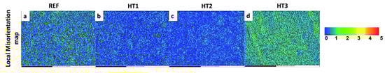 EBSD orientation map showing local misorientation maps in (a) REF, (b) HT1, (c) HT2, and (d) HT.