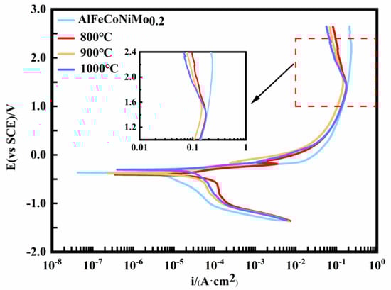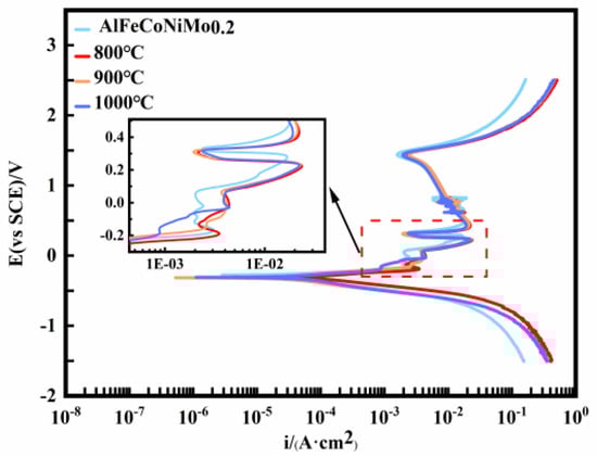 - In the SO42− environment, the 900 °C annealed state AlFeCoNiMo0.2 high-entropy alloy has better corrosion resistance than other alloys. The electrochemical test results show that the alloys all undergo secondary passivation, producing two successive product films to protect the metal substrate. The corrosion morphology shows that the priority corrosion areas are mainly concentrated in the grain boundaries and nearby dendritic areas, mainly due to the enrichment of Mo elements at the grain boundaries of the alloy after annealing. However, Mo reduces the corrosion resistance of the alloy in sulphuric acid solution;
