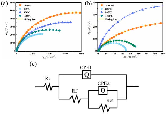 | As-cast | 0.5 mol/L H2SO4 | 1.841 | 353.7 | 1063 | 1.051 × 10−4 | 0.9341 | 8.139 × 10−4 | 0.8713 |