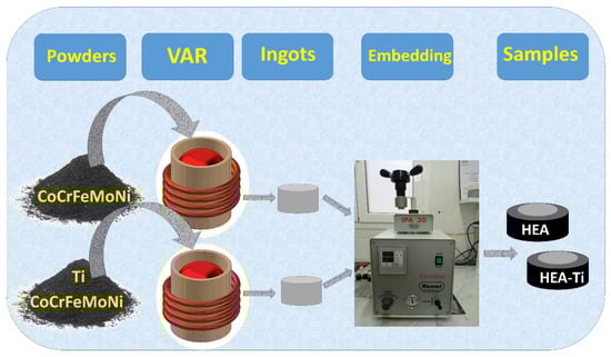 Raw materials with high purity levels of at least 99.7% for Co, Cr, Fe, Mo, Ni and Ti were utilized. The obtained alloys were subjected to 8 rounds of flipping and re-melting in VAR equipment under an inert Argon atmosphere to achieve adequate homogeneity. The resultant ingots were rods 10 cm in length and 1 cm in diameter. To carry out assessments of the structure, composition and mechanical properties, the samples underwent a three-stage surface processing procedure. First, they were embedded into a phenolic resin cylinder (see Figure 1) and then polished using SiC abrasive papers with increasing grain sizes ranging from 240 to 2000 grit. Following this, they underwent final polishing utilizing a 0.1 μm alpha alumina paste and were ultimately cleaned using ultrasonic-deionized water according to ASTM E3-11(2017) [].