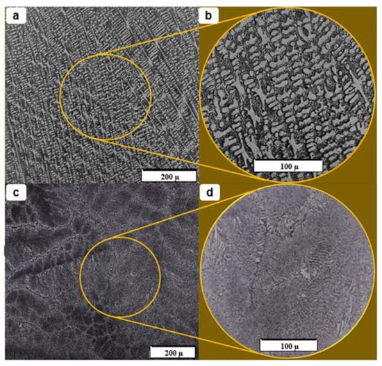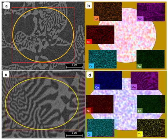 To study the effect of Ti doping on the microstructure, the base CoCrFeMoNi alloy (Figure 2a,b) and the Ti-doped one (Figure 2c,d) were examined using optical microscopy. The microstructure of both alloys is dense and free of cracks. From the images, it can easily be seen that the dimensions of the dendrites in the case of the Ti-doped alloy are much finer at the same magnification. Over the same surface area, approximately twelve grains of different diameters (bordered by grain boundaries) are observed in the Ti-doped alloy, while in the un-doped alloy there are only two coarse grains.