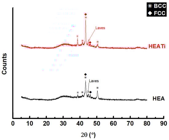 Taking into account that the grain size of the HEA sample is greater than that of HEATi (see metallographic images from Figure 2), the obtained values of microhardness are in accordance with the Hall–Petch relationship, which is based on the idea that the smaller the grains in a metal, the greater the number of grain boundaries per unit volume []. These grain boundaries act as barriers to dislocation motion, which is the primary mechanism of plastic deformation in metals. Therefore, a high density of grain boundaries can hinder the movement of dislocations and make it more difficult for the metal to deform plastically, resulting in an increase in microhardness.