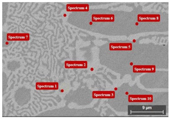 To uncover the chemical composition of the analyzed samples within different micro-areas identified as spectra, a semi-quantitative analysis was performed in ten points located on different phases (see Figure 6 and Figure 7): five in the dendritic zone (D) and five in the interdendritic zone (ID). Then, the mean and standard deviation were calculated. Table 2 and Table 3 display the measured concentration values of the elements detected in the respective alloys’ composition. An analysis comparing the microstructure of the two alloys revealed that upon introducing Ti to the CoCrFeMoNi alloy, there was a noticeable reduction in the volume fraction of interdendritic zones. It is common to observe the presence of the σ phase in this type of alloy, in addition to the FCC structure []. When Mo was added to the CoCrFeNi system, a eutectic structure emerged that contained intermetallic phases (σ and µ) within the FCC phase. This eutectic microstructure had a notable impact on the mechanical properties of the alloy, leading to increased hardness and yield strength. The Mo concentration in the interdendritic zone is the primary factor that contributes to the appearance of the σ phase []. The CoCrFeNiMo high-entropy alloy was found to contain an approximately 14% Cr- and Mo-rich σ phase []. In the HEA sample, the Mo concentration in the interdendritic zones dropped from 34.4 wt% to 15.6 wt%. In contrast, the Cr concentration remained steady, hovering around 20 wt%. This shift in concentration ultimately resulted in a decrease in the tendency to form a Laves phase.