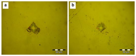 To determine the microhardness of the samples, an indentation test was conducted using a Shimadzu HMV 2T microhardness tester (Shimadzu, Kyoto, Japan) at 25 °C and 45% humidity. The sample, which had previously been polished to a mirror finish, was examined using an optical microscope before perpendicular microhardness measurements were taken. Indentations were made at 0.5 mm intervals along the sample diameter, using a load of 1.961 N and a dwell time of 10 s. In accordance with ISO 14577-1:2015 [], 10 indentations were made for each sample and the Vickers hardness (HV) was then calculated as the average value of each individual sample.