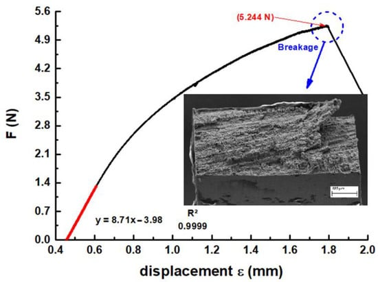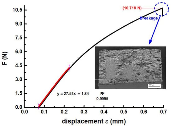 Figure 9 and Figure 10 present load-displacement diagrams obtained through the three-point bending test on two samples. The elastic limit of the alloy was identified as the point at which the sample returned to its original shape after deformation. Within this limit, the graph displayed a linear relationship, and the gradient of this line was calculated using the formula dF/dε = 48EI/L3, where E represents the Young’s modulus of the sample of length L, supported on two roller supports, and subjected to a concentrated load F at its center with a central deflection ε. To determine the second moment of area, I, the equation I = (a3·b)/12 was utilized, with a representing the sample’s depth and b representing its width. Using these calculations, the average modulus of elasticity for each alloy was determined, with results indicating that the alloy lacking Ti had a slightly lower modulus of elasticity than the Ti-containing alloy, as shown in Table 6. Ten samples of each alloy underwent testing.