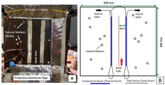Experiments were conducted at Clarkson University’s welding laboratory. A bead-on-plate weld was performed on a 300 mm × 300 mm × 6.35 mm A36 steel plate (European equivalent S235J2; Chinese equivalent Q235B), as shown in Figure 1. The welding lab is equipped with a Miller 350 power supply connected to a TIG welder. A 20 cm bead on plate manually performed at an average speed of 2 mm/s was executed by a professional welder. The power supply was set to an average voltage of 13.7 Volts, while the current was varied by the welder as the bead on plate was being performed. The average power for the 100 s weld was approximately 2500 Watts. It is important to emphasize that to assist in the computational welding mechanics (CWM) model validation and synchronization of the data, the use of fiducial markers was essential. The fiducial markers consisted of 6.35 mm holes randomly distributed but with known locations throughout the height of the plate, as shown in Figure 1. The introduction of fiducial markers was extremely helpful in determining the location of the WP at every instant in time during welding. One of the primary challenges in setting up this study was the synchronization of the data captured from the different measurement systems. This challenge was overcome through (i) the use of fiducial markers to determine the position of the WP along its path; (ii) the use of a stopwatch to determine the start time of two independent DAQ systems (cameras and LUNA fiber optic system); and (iii) the use of the same DAQ acquisition rates across all instruments. This served the authors well when synching the experimental findings with those of the VrWeld FEM. Previous attempts had been performed without fiducial markers, creating a major challenge in synching experimental and FEM results. The stochastic nature of a manual weld adds an extra layer of complexity in synchronizing computational and experimental data sets.